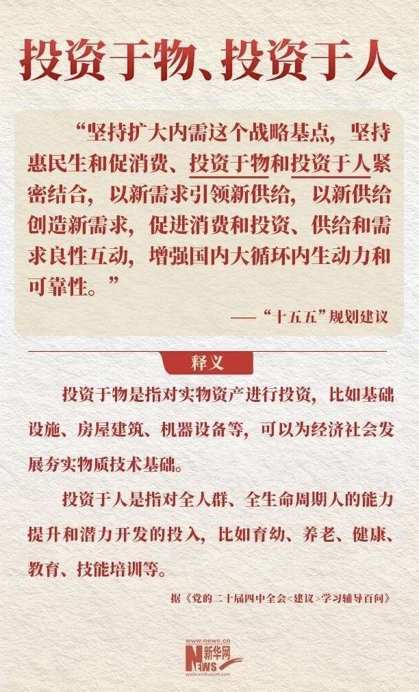 五是建立健全投资于人的长效机制,优化财政支出责任和财力配置,完善对地方政府考核和激励机制,充分激发各类经营主体活力,建立健全相关统计制度,将对人的投资纳入统计核算范围,调动全社会、各方面投资于人的积极性主动性创造性。(据《党的二十届四中全会<建议>学习辅导百问》)