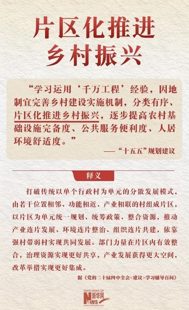 “十五五”时期,各地要积极相互借鉴,探索推进乡村全面振兴的具体抓手,结合当地发展水平、资源状况、城乡空间形态等,以片区为单元推进布局、规划、建设,推进资源整合和力量统筹,分级引领示范,分片梯次推进,循序渐进、久久为功,推动“千万工程”经验落地开花。需要注意的是,片区化推进乡村振兴要突出实效,充分发挥市场机制作用,认真听取农民意见,始终尊重农民意愿,切实保障农民合法权益,保持农村集体资产所有权主体稳定,实事求是划定片区和确定片区化推进节奏,不能简单压指标、搞“齐步走”和“一刀切”。(据《党的二十届四中全会<建议>学习辅导百问》)