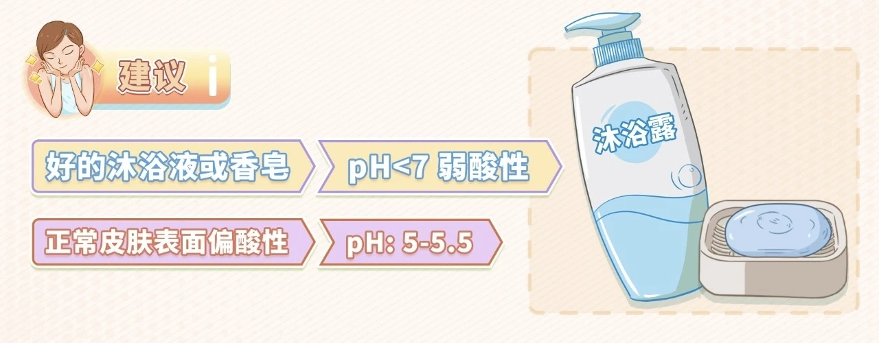 另外,人体正常皮肤表面pH值为5-5.5,偏酸性,洗澡时建议选择pH值<7的沐浴液或香皂。