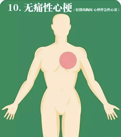 患者仅表现出轻微的胸闷,上腹部堵闷、不适、恶心、憋气等症状。糖尿病、闭塞性脑血管病或心衰的老年病人易出现无痛性心梗,容易漏诊。
