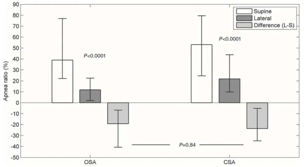 参考资料 [4]:以阻塞性睡眠呼吸暂停(OSA)和以中枢性睡眠呼吸暂停(CSA)为主的患者在仰卧位(空心柱)和侧卧位(深色柱)时的呼吸暂停比率(AR)。浅色柱代表侧卧位与仰卧位之间的差异。