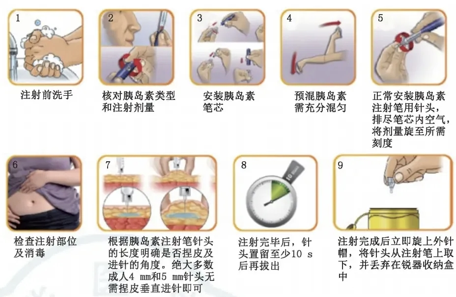 (1)准备:洗手→拿出胰岛素笔(确认是自己的药)→装针头(拔下保护帽)。