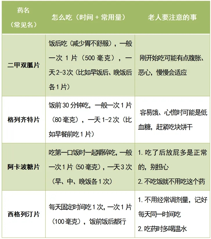 (1)所有药都要按医生说的吃,别自己加量、减量,哪怕感觉血糖不高也不能随便停。