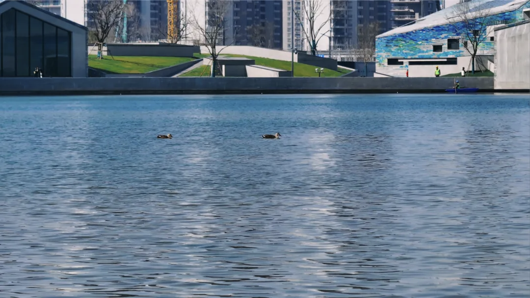 瞳湖采用再生水循环系统,白鹭野鸭在此栖息,生机盎然,简约穿搭打卡,赛博感与春日温柔兼具,轻松拿下朋友圈C位!