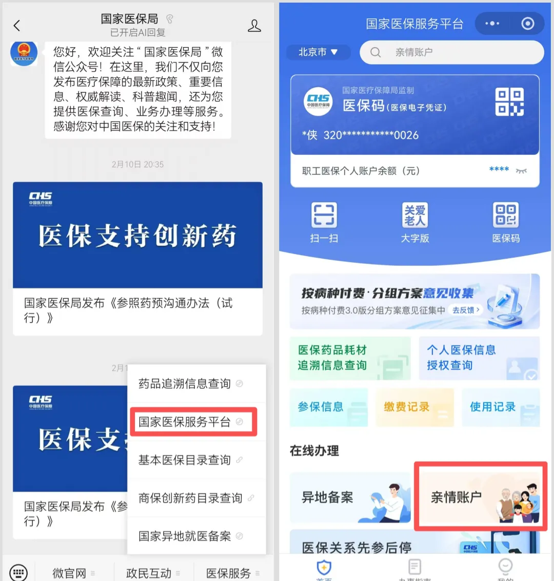 可以关注“国家医保局”微信公众号,点击医保服务→国家医保服务平台,进入“亲情账户”操作页面。