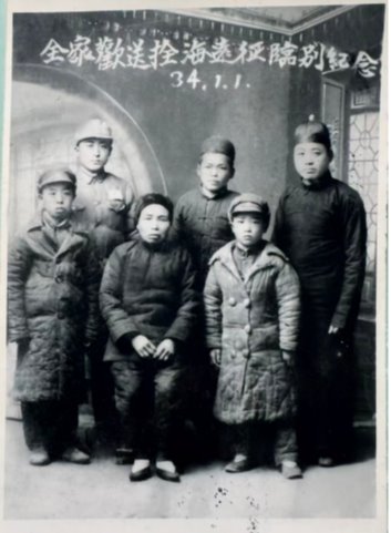 因此,这个好心的东家就动员父亲去应征入伍,并由他想办法打通关节为父亲办理中学生的相关手续。父亲当年刚满16岁,就这样成为了一名为活命、为拯救家人,为民族、为国家、为打败日本侵略者,毅然奔赴抗日前线的年轻英俊的抗日战士。临出发前,父亲穿着一身正气的抗战军装,和大伯从蒲城回到家里,向奶奶、三叔、四叔及村民们正式告别,并于民国三十四年(1945年)1月1日,全家所有人一起走进大荔县城一家最好的照相馆,留下了十分珍贵的“全家欢送拴海远征留念”的唯一一张全家福照片,也是全家人有生以来的第一张照片。正因为如此,令我感到非常难过的是,始终未能见到过爷爷的容貌,只听村上人说我父亲长的很像爷爷。