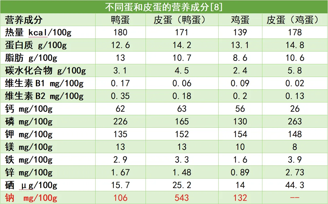 此外,因为制作工艺中加入了碱,在高 pH 值和金属离子浓度下,皮蛋中的维生素 B1、维生素 B2 会被破坏,且钠含量会偏高。但如果合理利用皮蛋,倒是有助于控血压。比如用皮蛋做菜肴的时候可以不放盐,比起用鲜蛋炒菜手动加盐或许更有利于减少盐的摄入。