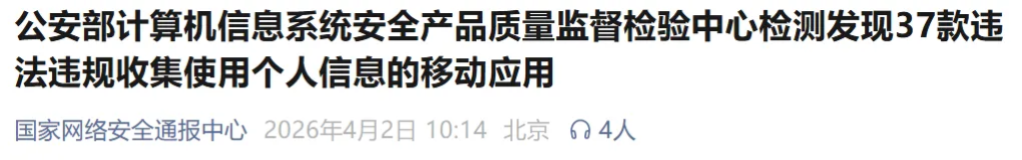 依据《中华人民共和国网络安全法》《中华人民共和国个人信息保护法》等法律法规,经公安部计算机信息系统安全产品质量监督检验中心检测,37款移动应用存在违法违规收集使用个人信息情况,具体通报如下:
