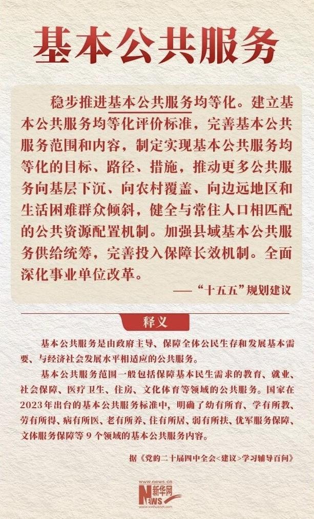 四是加大基本公共服务保障力度。强化基本公共服务中央事权和支出责任,合理提高基本公共服务支出占财政支出比重,构建多元供给格局,完善基本公共服务均等化投入保障长效机制。(据《党的二十届四中全会<建议>学习辅导百问》)