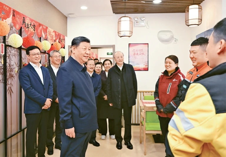 2026年2月9日至10日,中共中央总书记、国家主席、中央军委主席习近平在北京考察并看望慰问基层干部群众。这是10日上午,习近平在西城区新街口街道父母食堂考察时,同在这里休息的快递小哥亲切交流。 新华社记者 谢环驰/摄