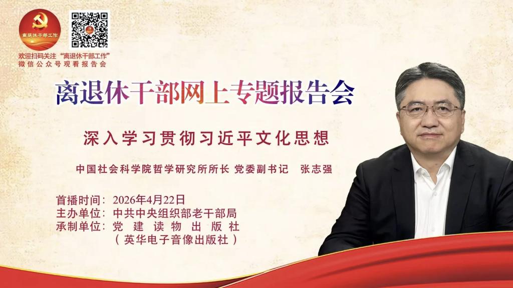 报告会将于4月22日在“离退休干部工作”微信公众号发布,由各级老干部工作部门结合实际,组织引导广大离退休干部和老干部工作者在线收看。